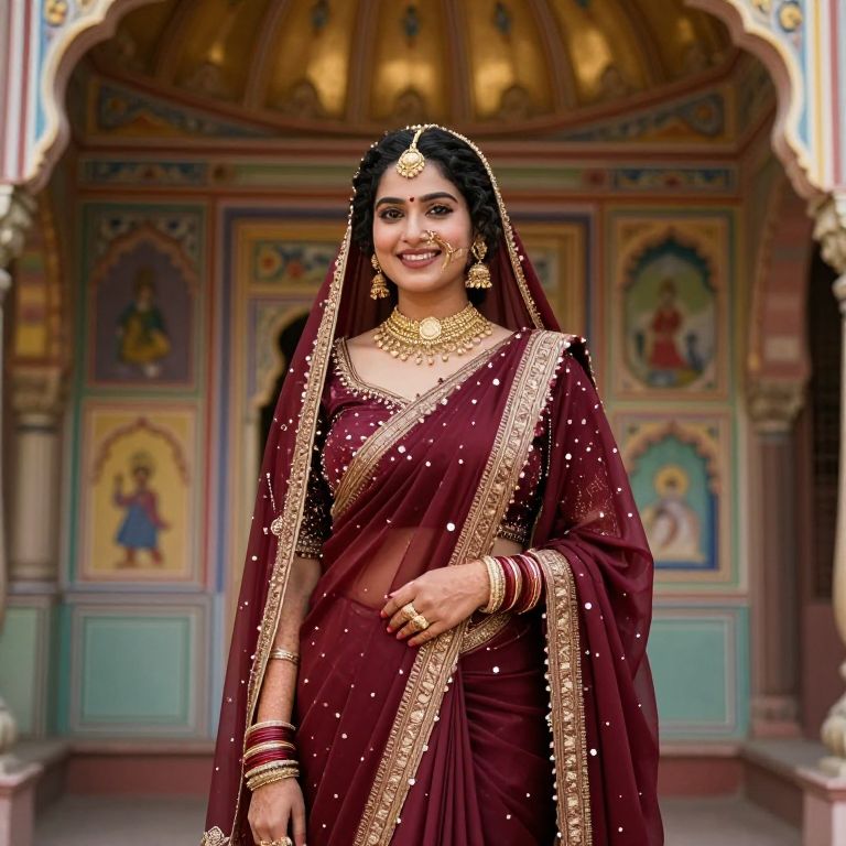 Photograph of a smiling Indian woman with medium brown skin and black hair, adorned in a maroon traditional sari with gold embroidery and pearl embellishments. She wears a gold headpiece, heavy gold necklace, earrings, and a matching gold maang tikka. Her dark hair is covered by a maroon veil. She stands in a colorful, ornately decorated room with arched windows and painted religious figures in the background, showcasing a rich, cultural setting. The image exudes a sense of traditional elegance and pride.