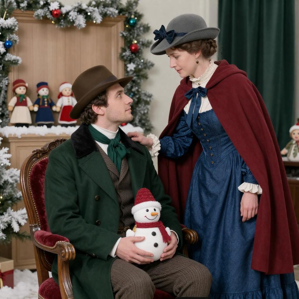 Photograph of a festive scene with Santa Claus in a red suit on the left, a woman in a maroon coat and red hat holding a blonde child in a blue dress, a man in a brown top hat and black coat, another woman in a red dress with blonde hair, and a man in a black top hat and beige coat with antlers. Christmas trees and garlands in the background. The group is standing behind a black iron fence adorned with white and red flowers. The woman in the maroon coat smiles at the child, while the man in the brown coat looks down at the child. The man in the beige coat with antlers waves. The blonde child looks at Santa Claus