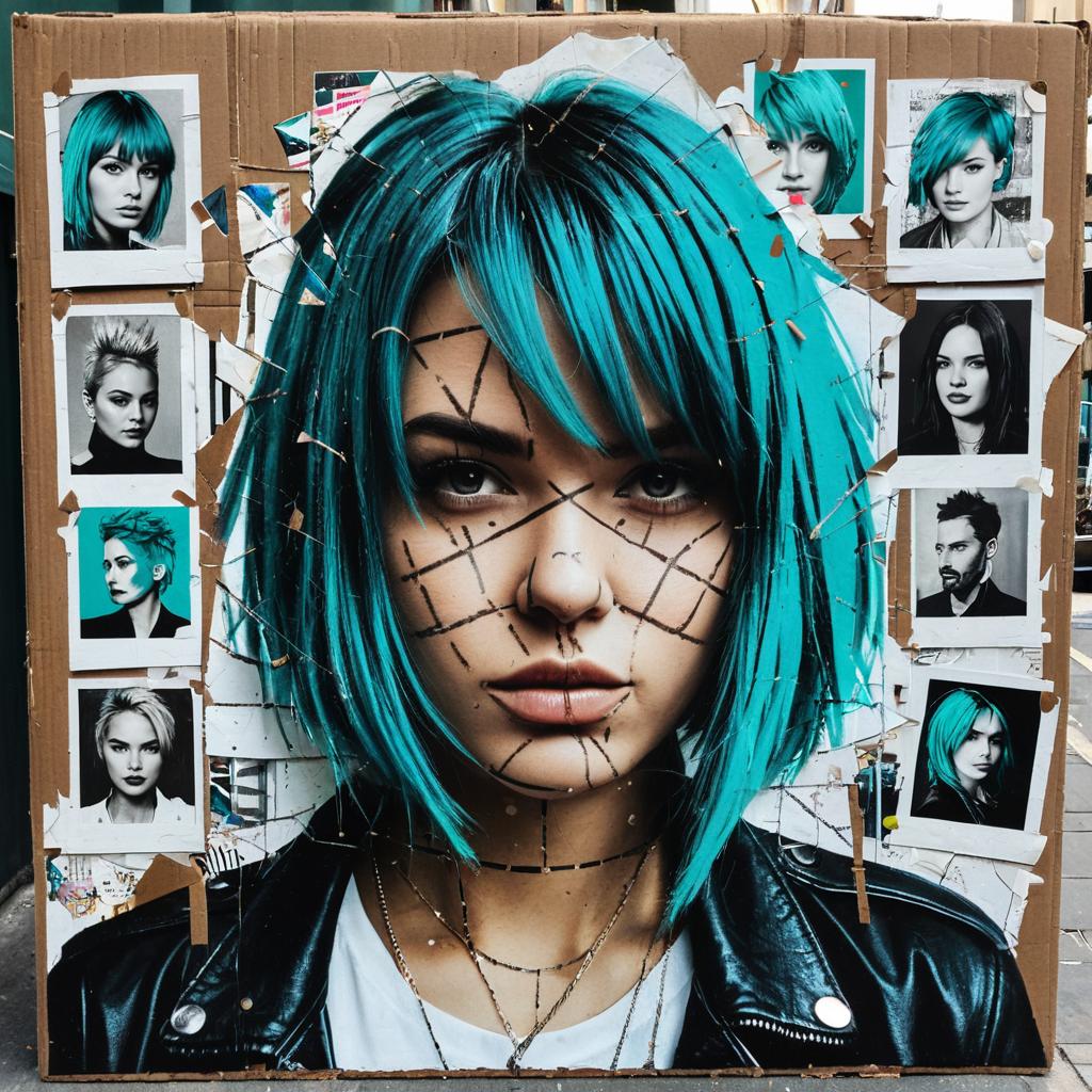 Girl, with turquoise hair, in the style of multi-layered collages, edgy street art, celebrity-portraits, cardboard, fragmented icons, realistic hyper-detail, crossed colors