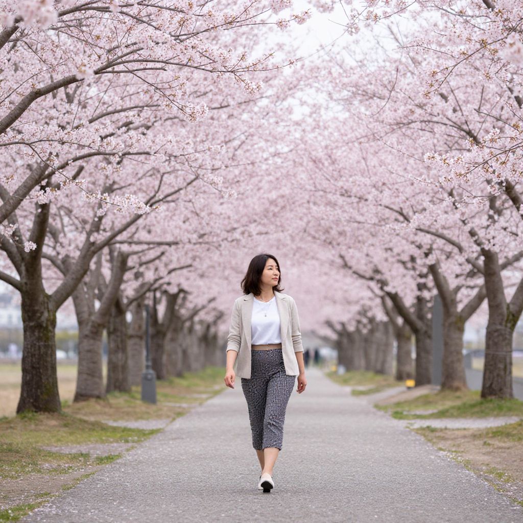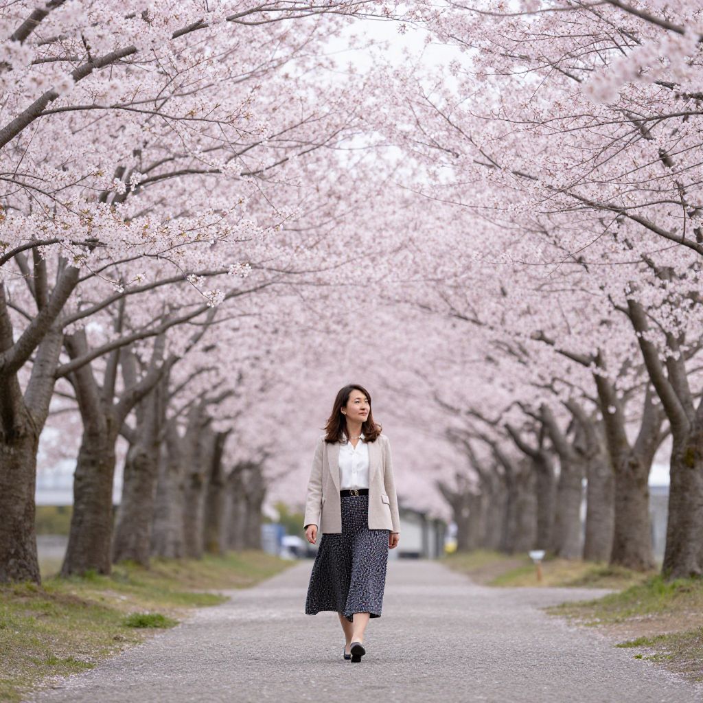 Pathway lined with blooming cherry blossoms leads to a serene scene where a woman in a stylish outfit walks gracefully, framed by rows of vibrant pink trees under a soft sky, embodying the essence of Hanami.