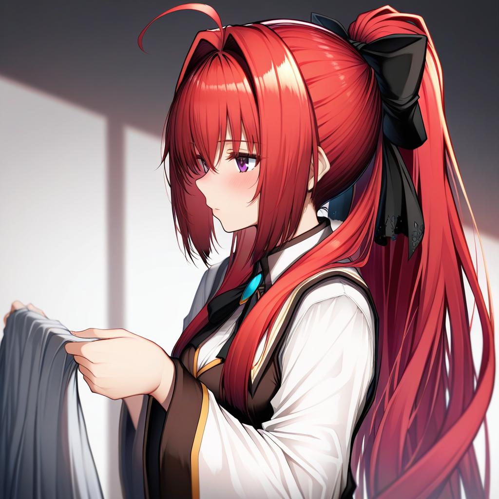 Illustration of an anime girl with very long red hair styled in a ponytail and adorned with a large black bow. She has red eyes and an ahoge hairstyle detail. The girl is wearing a white and brown outfit with gold accents and a turquoise brooch, holding a gray fabric in her hands. The lighting creates a soft shadow in the background.