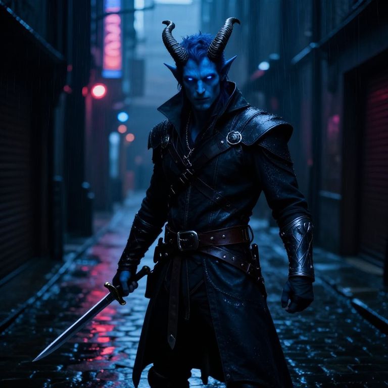 Male blue tiefling rogue in a shadowy urban alley, wearing sleek dark clothing with leather straps and steel accents, pale blue skin contrasted by piercing electric blue eyes, long, twisted horns, wielding twin daggers, rain-soaked cobblestones reflecting neon lights, cyberpunk fantasy blend.