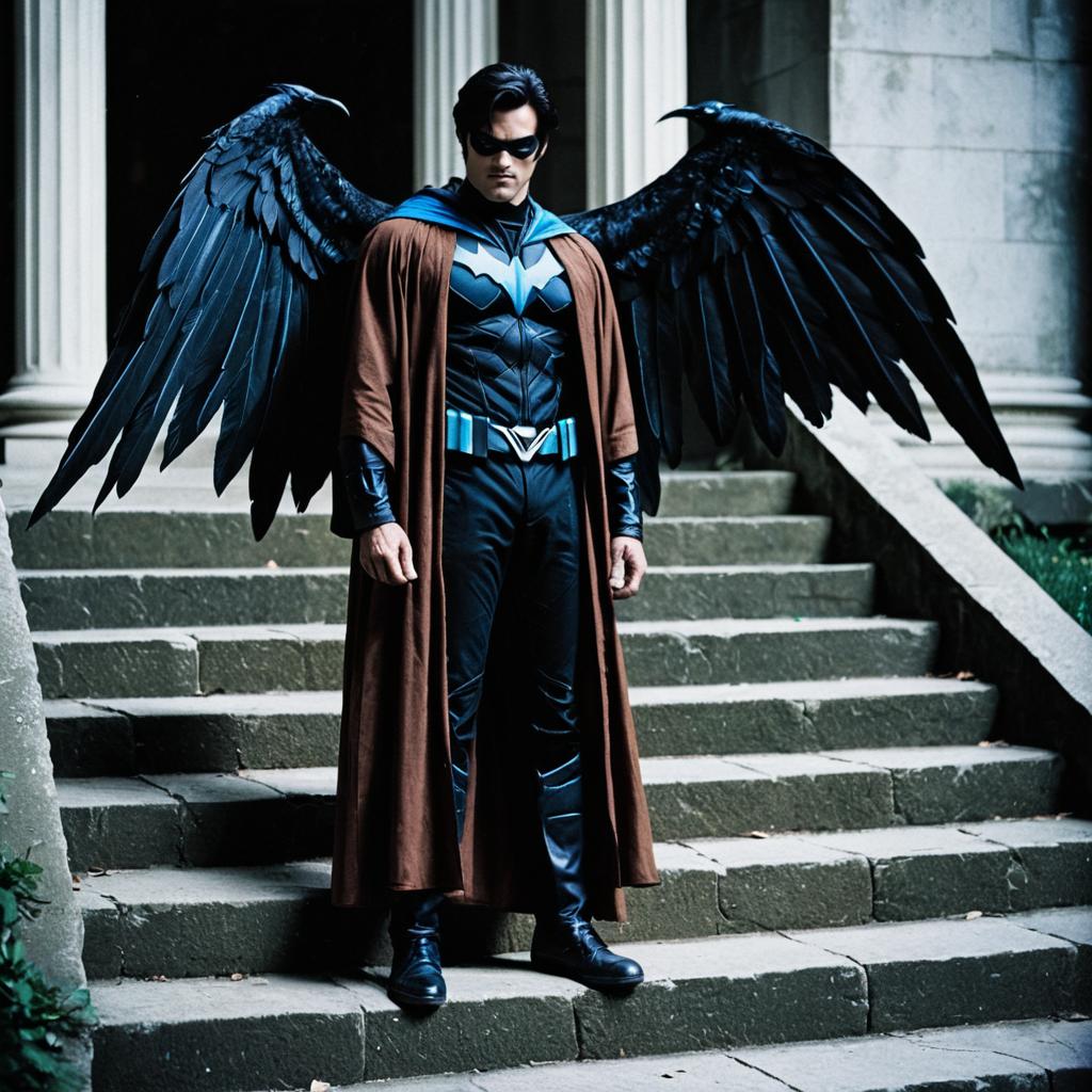 Nightwing Old Costume, man in a brown robe and black wings standing on a stone step