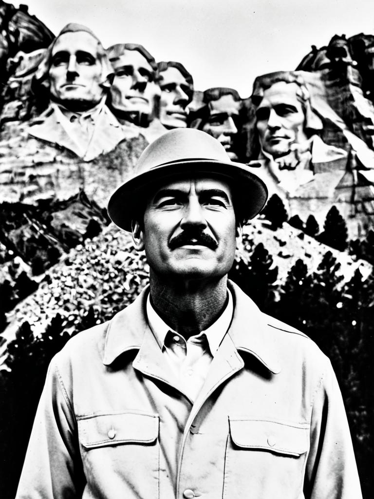 Man in Mount Rushmore costume, cinematic realism, humorous studio shot