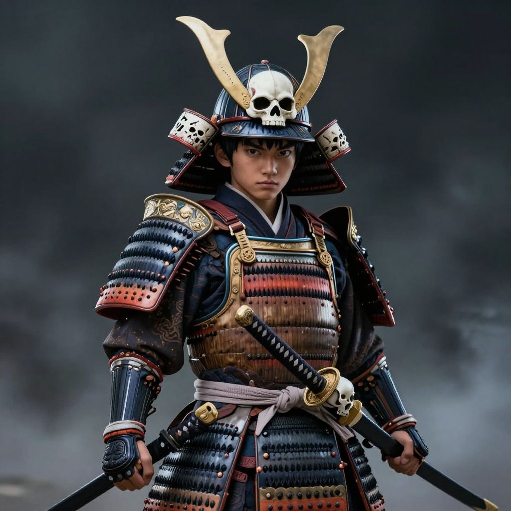 (high quality), (masterpiece), (detailed), 8K, Hyper-realistic illustration depicts (Japanese boy1.3) clad in (intricately designed samurai armor1.3) with a (skull-shaped helmet1.2) adorned with (golden horns1.2). He holds a (katana1.2) with a (skull-emblazoned scabbard1.2), standing amidst a (dark, misty background1.2). In the style of Yoshitaka Amano, trending on Artstation.