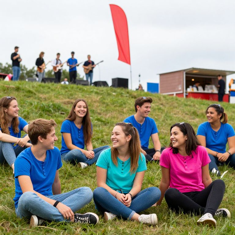 A vibrant photograph captures a group of six young adults, three men and three women, sitting on a grassy hillside. They are laughing and chatting, wearing casual blue and pink t-shirts with jeans and black sneakers. The woman in the center has brown hair in a ponytail, wearing a blue shirt, and the woman to her right has dark hair in a ponytail, wearing a pink shirt. In the background, a red and white flag flutters, and several people stand near a food truck with a red and white striped canopy. The sky is overcast, adding a soft, diffuse light to the scene.