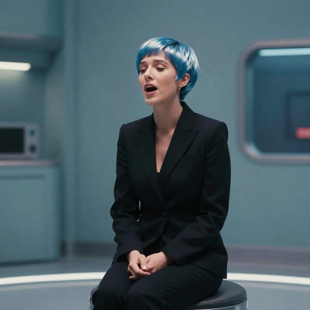 Realistic photo.Interstellar Robot, short metallic blue hair, wearing a sleek black suit. Sitting in a teal blue room, singing to herself. Wes Anderson style color schemes, haze, Cinematic, cove lighting, shot with blackmagic pocket cinema camera 6k, 35mm f:2, wide realistic photo