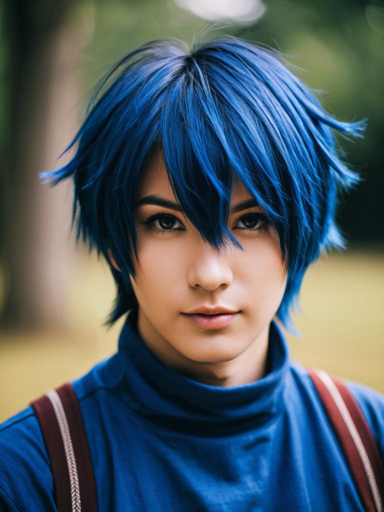 Photo-realistic cosplay photo of person in aoyagi touya costume. 1boy, grey eyes, hair between eyes, blue eyes, mole under eye, short hair, two-tone hair, split-color hair, dark blue hair, long sleeveslifestyle stock photo, shallow depth of field, lifestyle stock photography, shallow depth of field, natural lighting, warm tones, soft background blur, candid moments, vibrant colors, realistic textures, modern casual clothing. full body shot