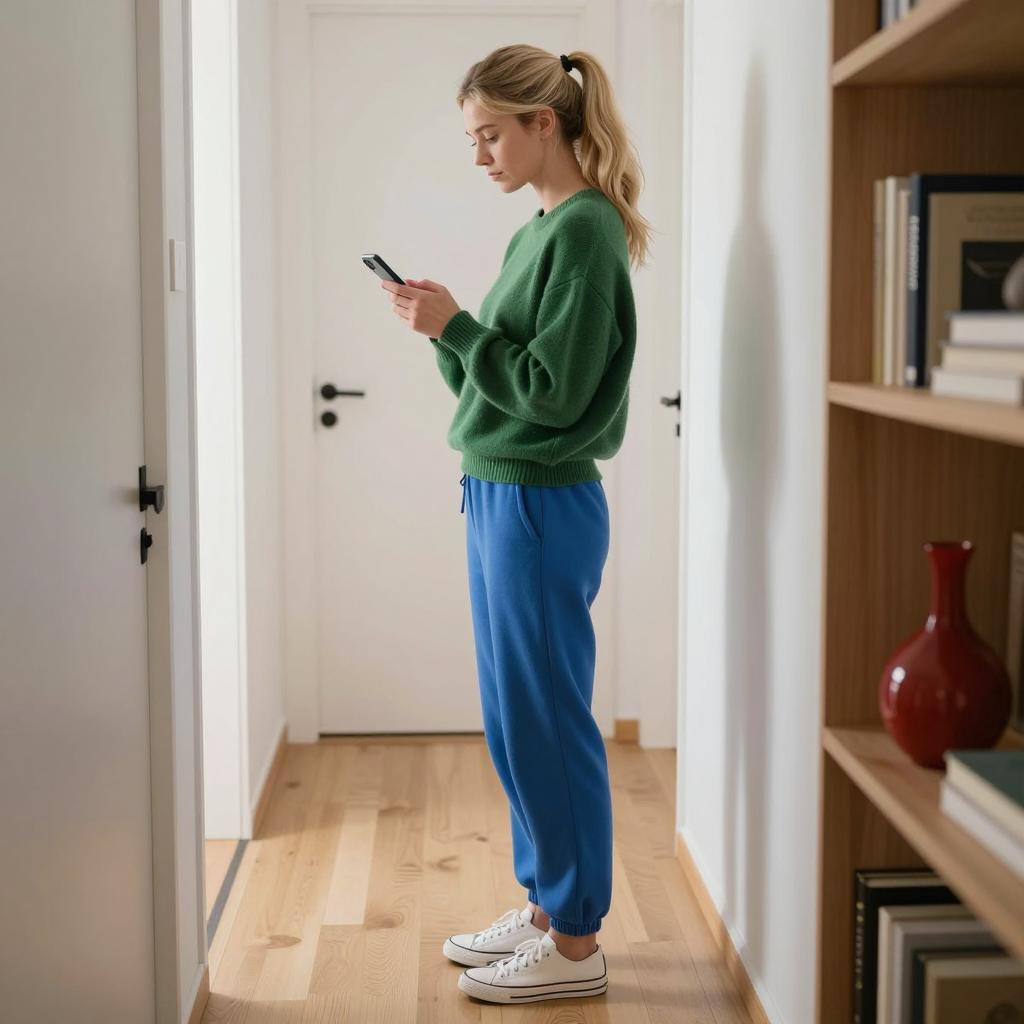 Blonde woman with ponytail, wearing green sweater and blue sweatpants, standing in hallway, looking down at smartphone, right profile. Wooden floor, white walls, bookshelf with books and red vase on right. Soft natural light from background.