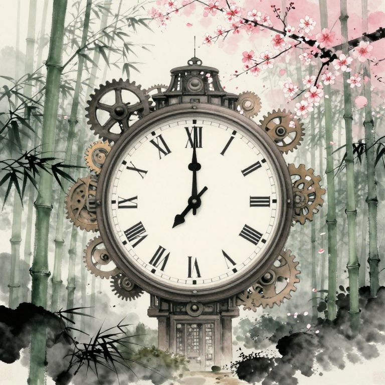 Steampunk clock with Roman numerals, gears, and black hands, set against a background of bamboo and cherry blossoms. Digital artwork.