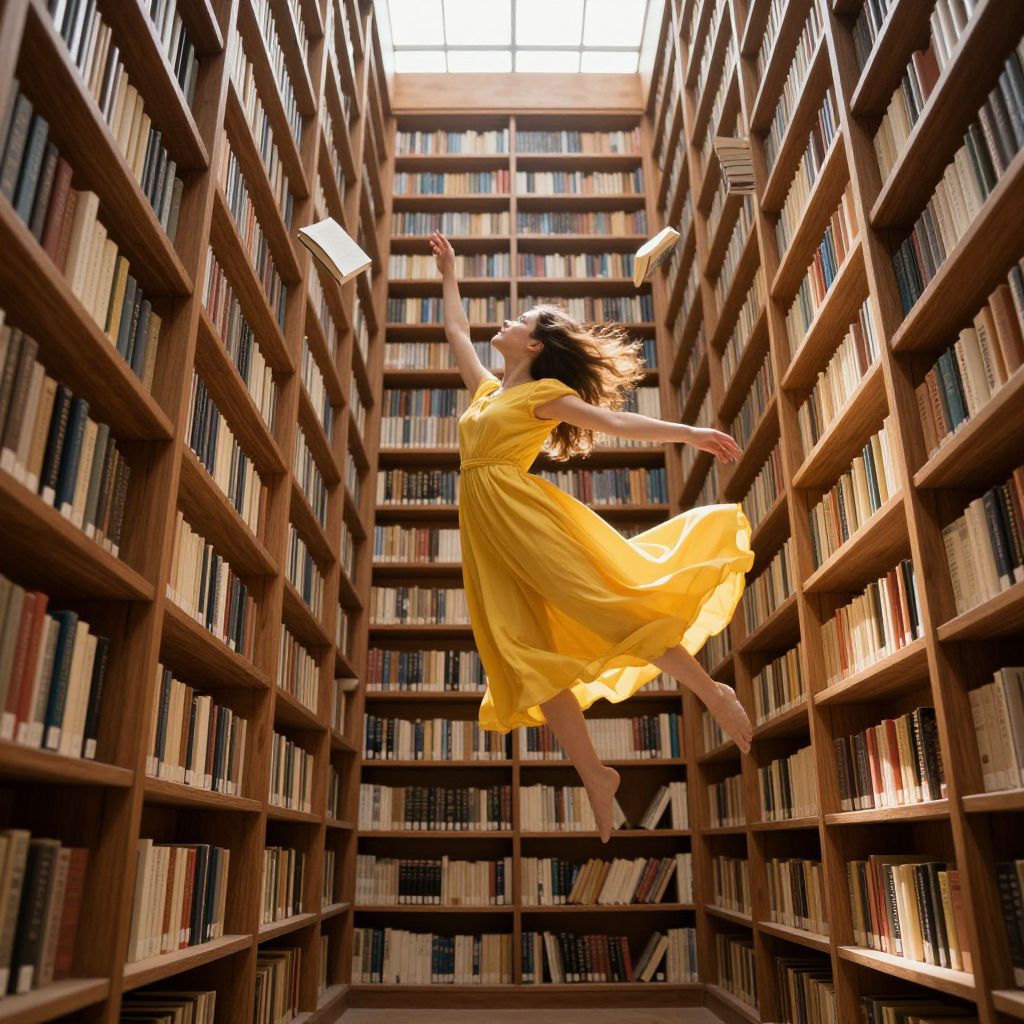 Books float gracefully through the air as a woman in a flowing yellow dress levitates serenely between towering wooden shelves in a sunlit library, creating a surreal scene where knowledge and freedom intertwine.