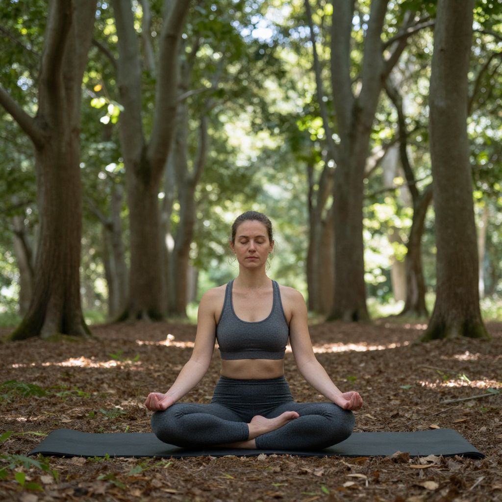 Woman meditating serenely in a forest clearing, seated cross-legged on a yoga mat with hands resting gently in her lap, surrounded by dappled sunlight filtering through tall trees.