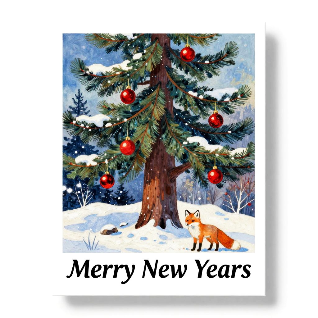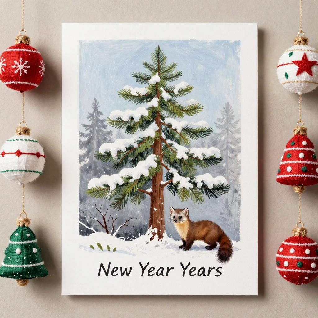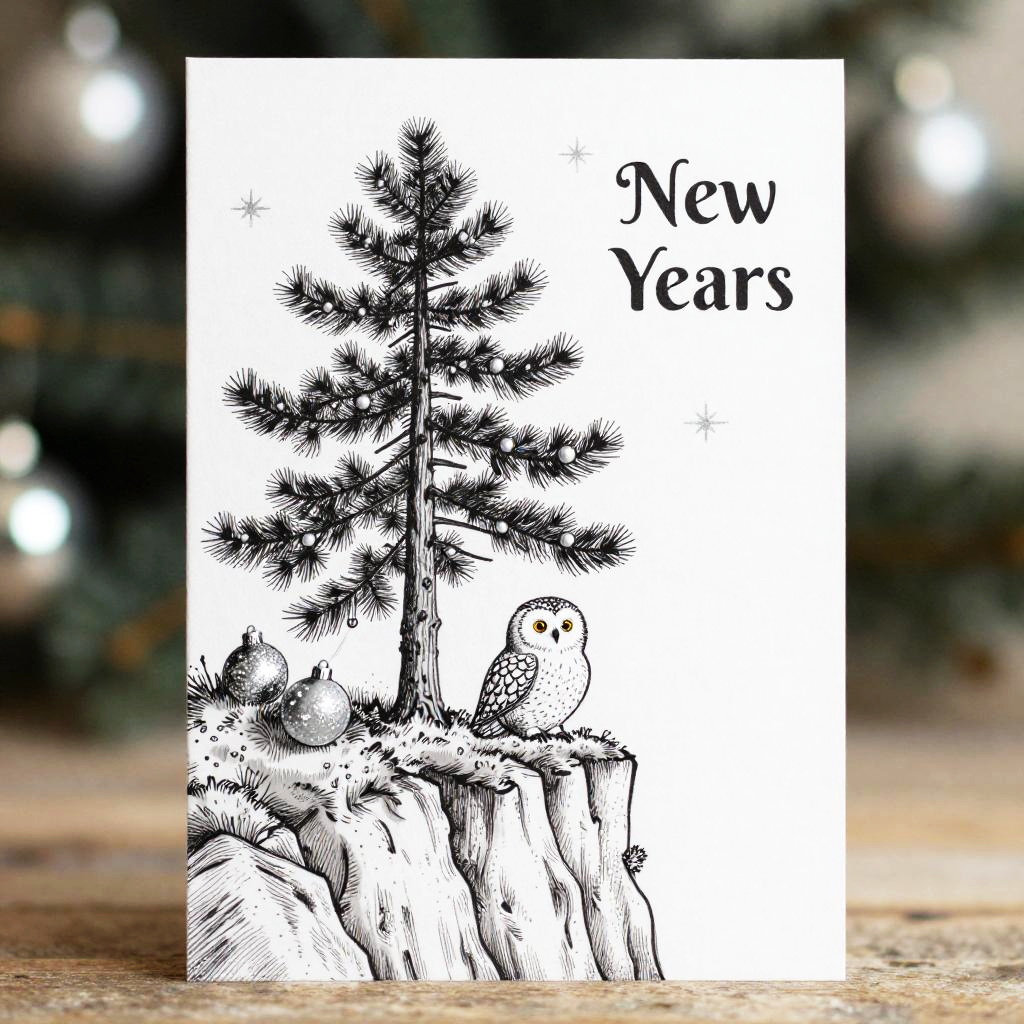 A New Year's card in the style of a delicate line art, a small snowy owl on the background of a majestic, tall pine tree that stands on the cliff, decorated with delicate silver Christmas tree balls