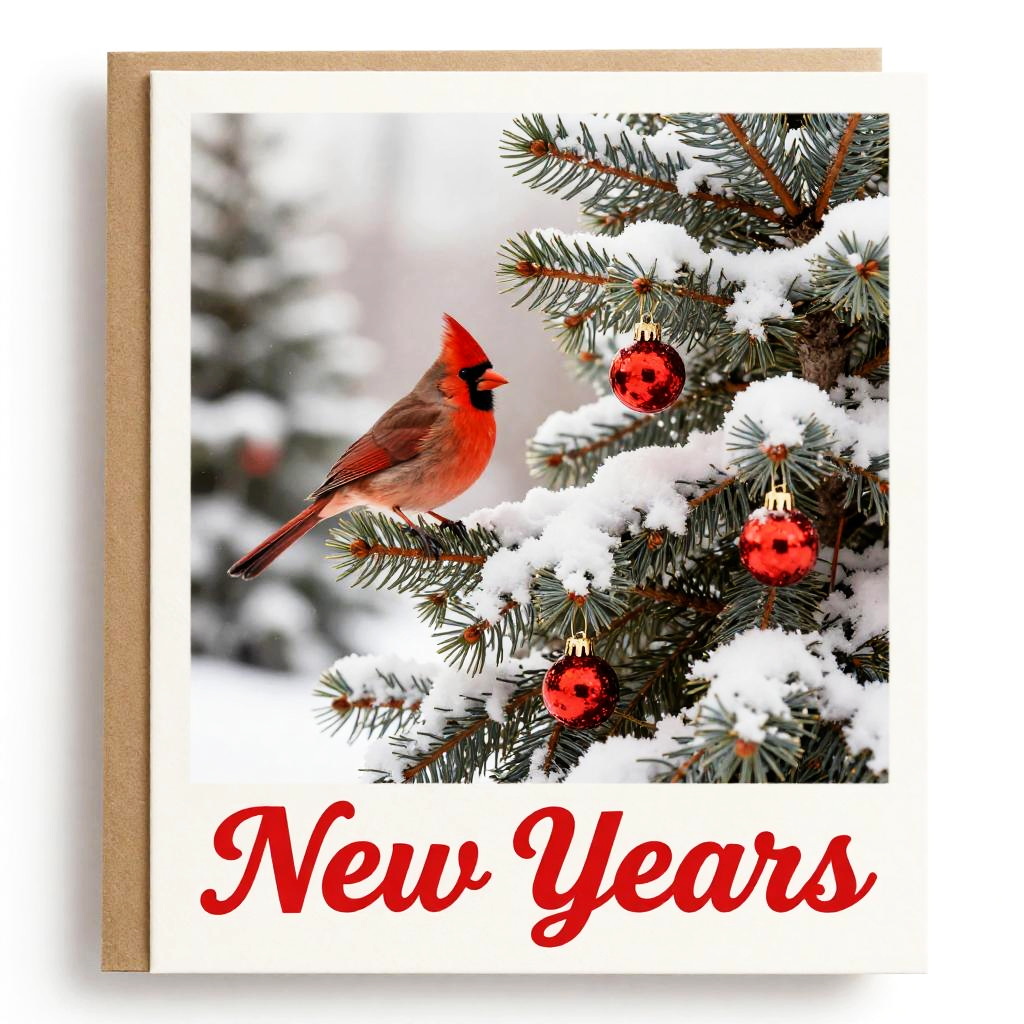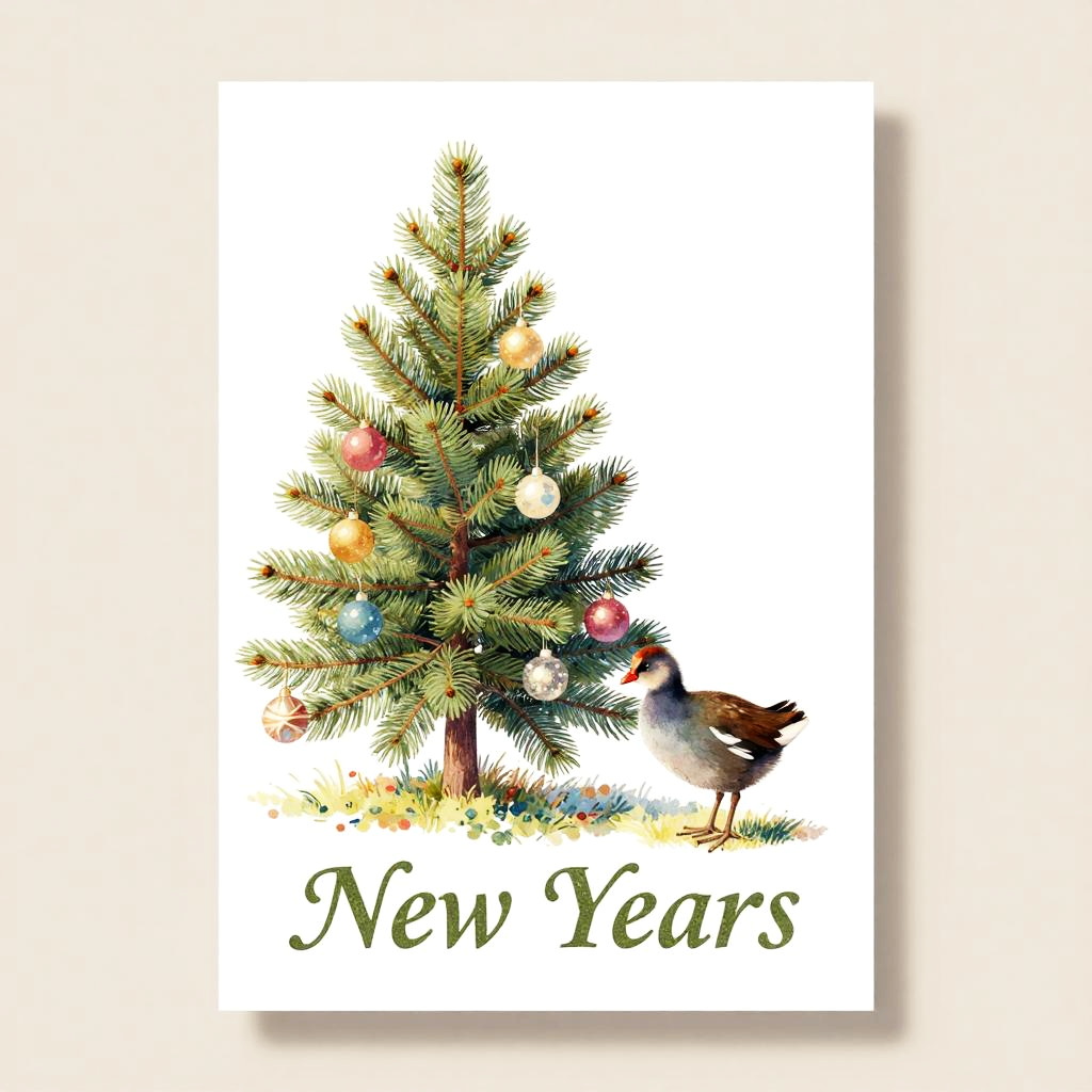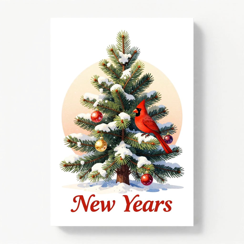 A New Year's card in the style of a delicate line art, a small snowy owl on the background of a majestic, tall pine tree that stands on the cliff, decorated with delicate silver Christmas tree balls