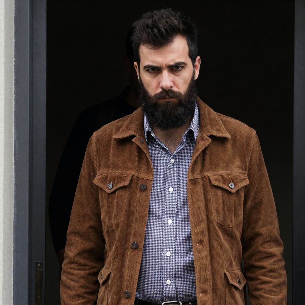 Bearded man with dark hair and intense expression, wearing brown corduroy jacket over checkered shirt, standing in doorway. Background includes metal frame and dark interior. Partially visible black jacket behind him. Number of people: 1.