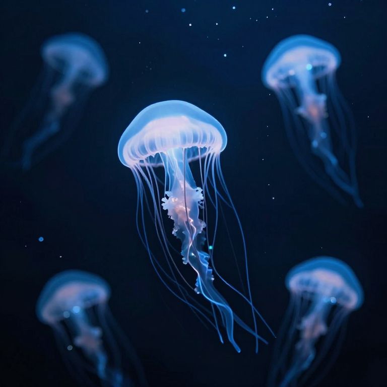 Amidst the depths of an ethereal abyss, glowing jellyfish drift like celestial embers, their rhythmic pulses echoing the forgotten dreams of a slumbering world, weaving a tapestry of serenity and mystery.