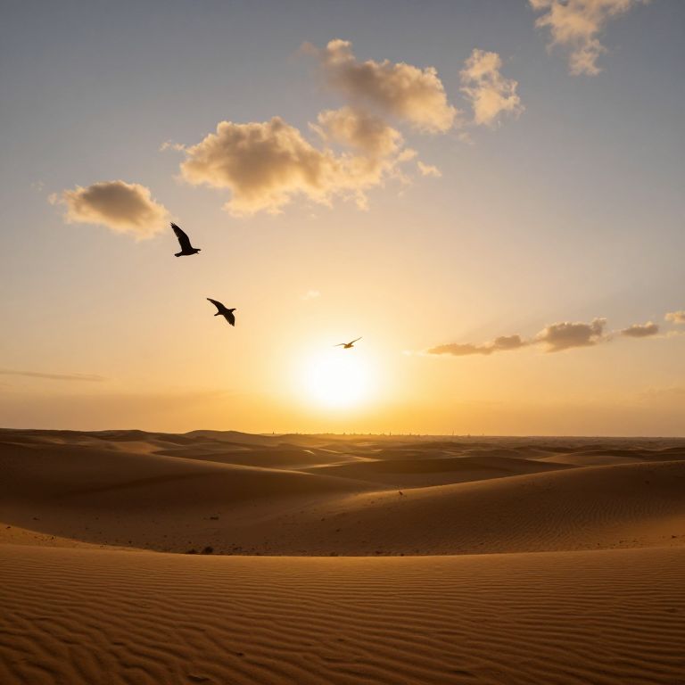 Sunset bathes a vast, undulating desert landscape in golden hues, as silhouetted birds soar gracefully against a backdrop of fluffy clouds and a radiant sun near the horizon.