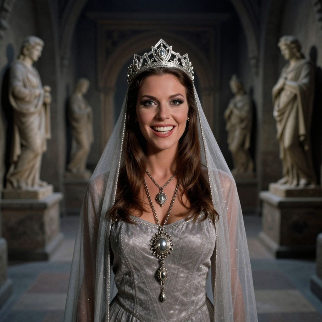 Photograph of a smiling woman with fair skin and long brown hair, wearing a silver tiara, translucent veil, and a shimmering silver gown with intricate lace. She has bright blue eyes and wears a silver necklace with a large, ornate pendant. The background features a dimly lit, Gothic-style cathedral with statues of classical figures in the shadows, creating a dramatic and regal atmosphere. The woman is centrally framed, with the statues blurred in the background, emphasizing her as the focal point. The image has a fantasy or fairytale-like quality.