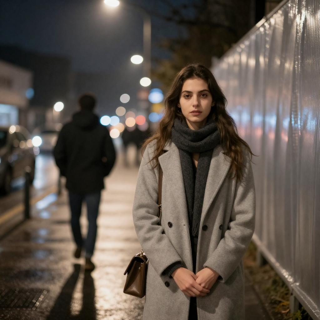 Photograph of a young woman with long brown hair, wearing a gray coat and dark scarf, standing on a wet, illuminated street at night. She clasps her hands in front of her. A silhouetted man walks in the background. Bright streetlights and blurred city lights create a bokeh effect. A plastic-covered wall is on the right.