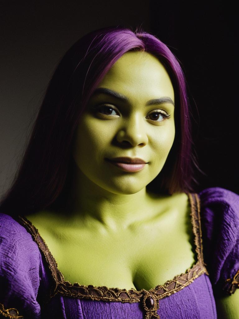 Close-up portrait of a woman wearing a Shrek costume with green skin makeup and a purple dress with lace trim. The image features soft shadows and a dark background, highlighting her facial features and costume details.