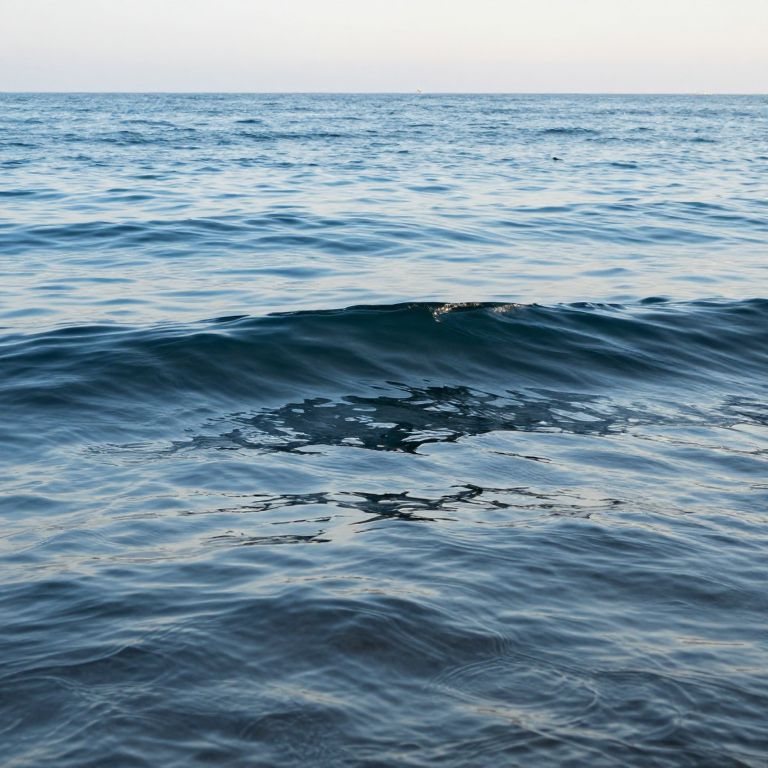 A stunning close-up photograph of ocean waves with fluid blues layered wave textures, capturing the dynamic movement of water in a calm coastal morning; the surface reflects soft sunlight with gentle ripples, showing intricate patterns of layered blues and silvery undertones, set against a vast horizon with a few distant sailboats.