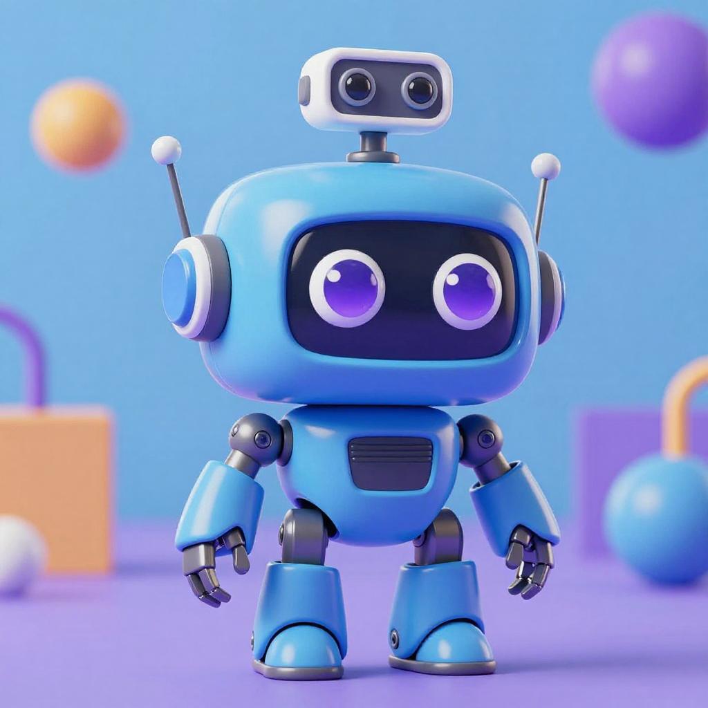3D illustration of a cute cartoon robot with a blue body, large round purple eyes, antenna camera on top, and articulated arms and legs. Playful and toy-like design with colorful background in shades of blue, purple, and orange.