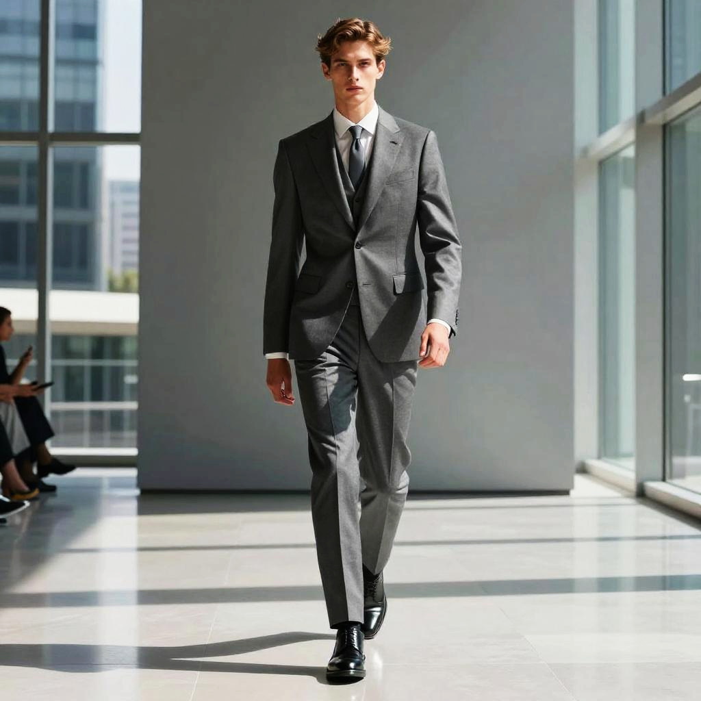 A high-end editorial photograph of dynamic gymnast striding a couture runway in gleaming gymnasium with polished wooden floor and large windows at sunrise, wearing sleek metallic blue leotard with subtle sparkles and white athletic sneakers. Strong key light from the left casts crisp highlights and a soft pink hue across a minimalist backdrop; full-body framing, clean shadows, reflective floor, ultra-detailed textures, futuristic yet elegant mood, minimal props, balanced color, high contrast, magazine-cover energy.