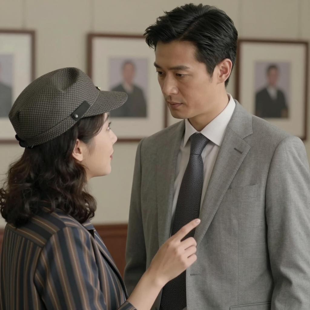 Two people sitting on a beige couch in a modern living room. Man on left, glasses, striped shirt, dark vest, arm raised. Woman on right, short brown hair, black headband, beige sweater, facing him. Glass coffee table between them. Soft lighting, white lamp, potted plant in background. Man's face showing animated expression. Woman's face neutral. Warm, indoor setting.