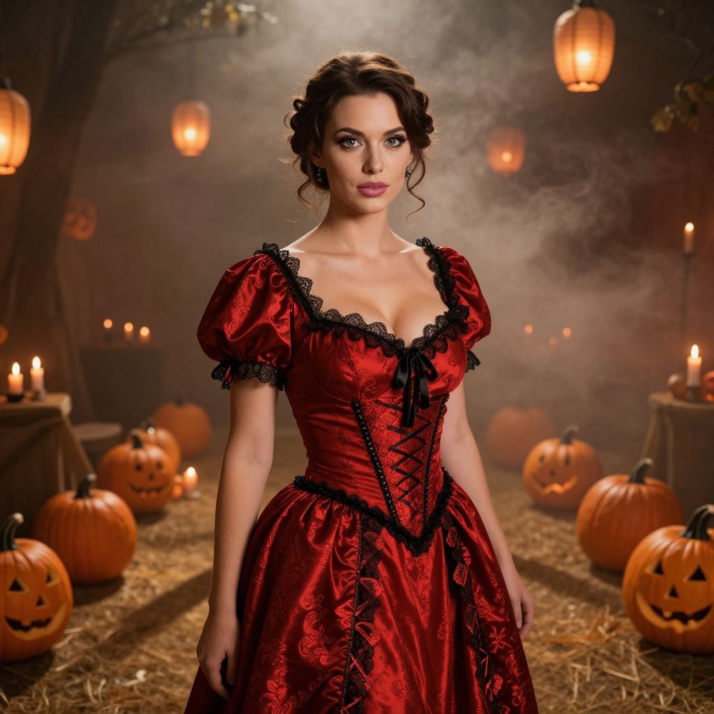 Photograph of a woman with dark hair in a Victorian red lace dress, standing in a Halloween-themed setting with glowing lanterns and carved pumpkins.