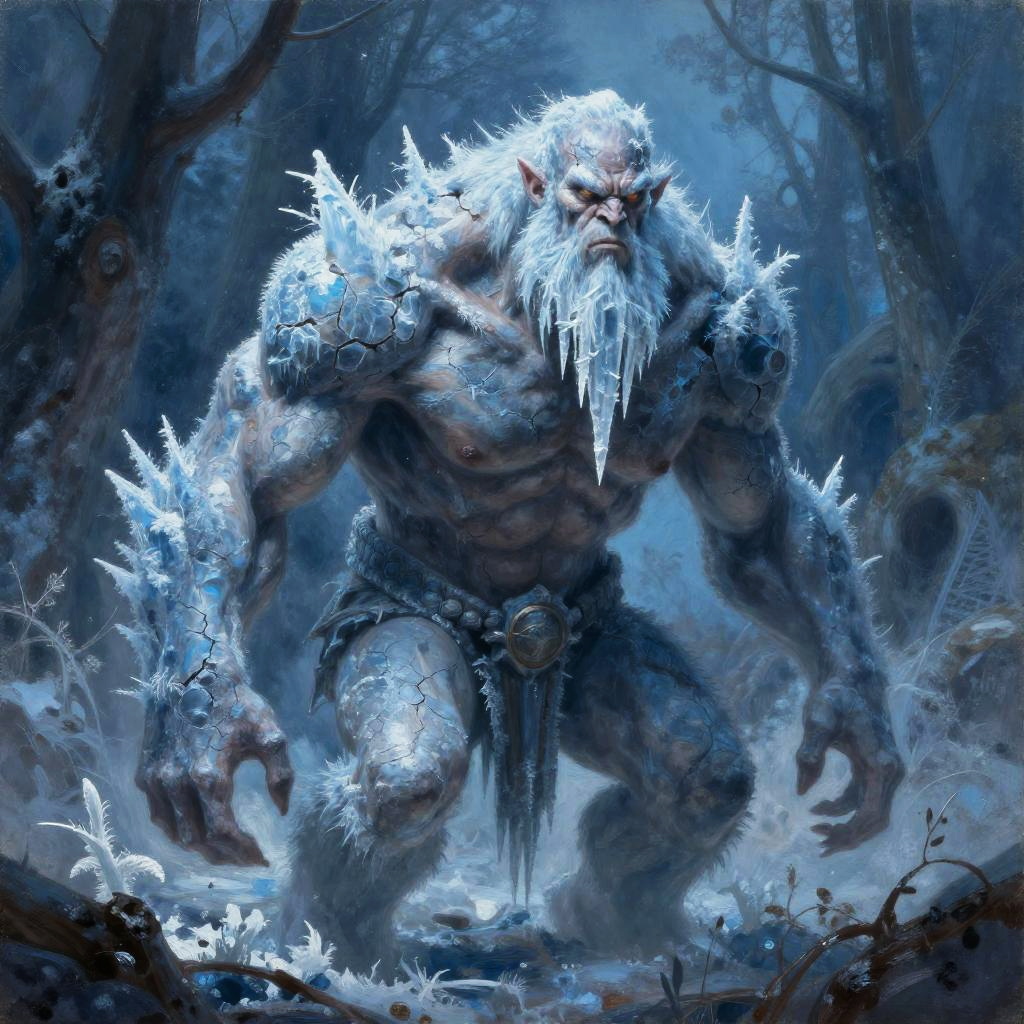 Warhammer fantasy RPG style frostbitten giant, highly detailed oil painting with icy blue and frosted white tones. Set in a mystical forest with cracked frozen skin and icicle beard, evoking a dark and ominous atmosphere.