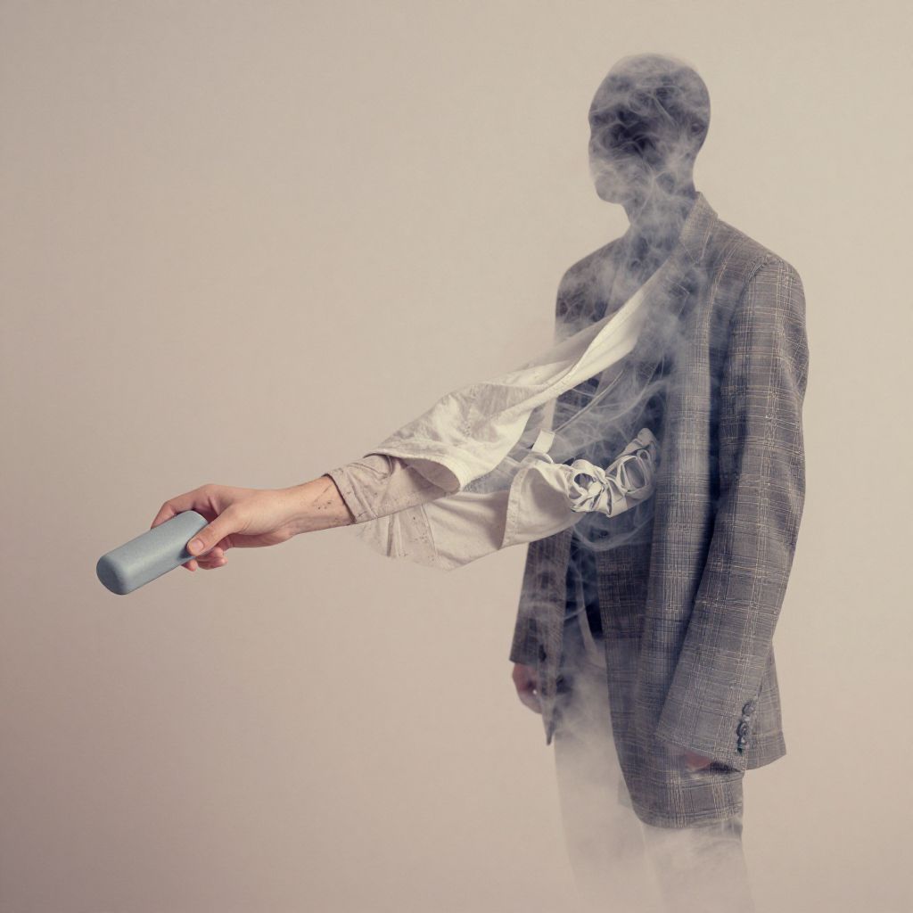 Clothing eraser in action, a surreal scene where clothes fade away from a human figure like erased pencil marks, smoky textures, ethereal atmosphere, pastel color palette with soft shadows, dreamy and conceptual visual storytelling