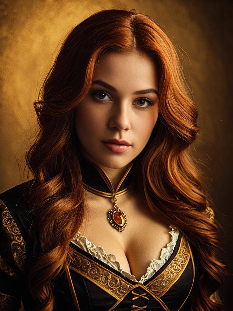 Portrait of a young woman with long straight brown hair wearing a detailed Mari Makinami Illustrious cosplay costume featuring shiny gold and black fabric with puffed sleeves. The image has warm, golden lighting emphasizing the texture of the costume and the natural complexion of the model.