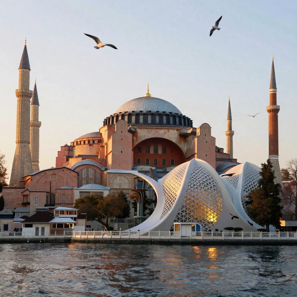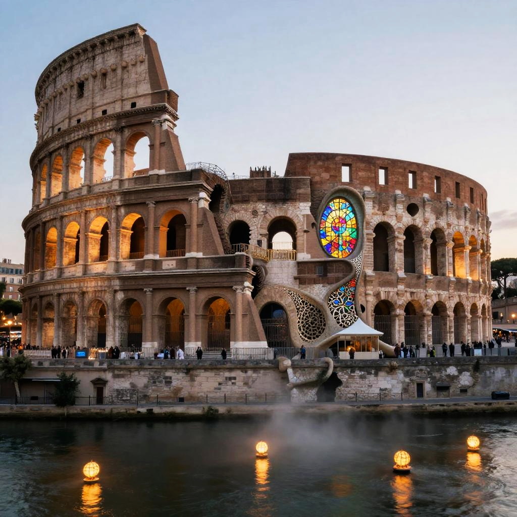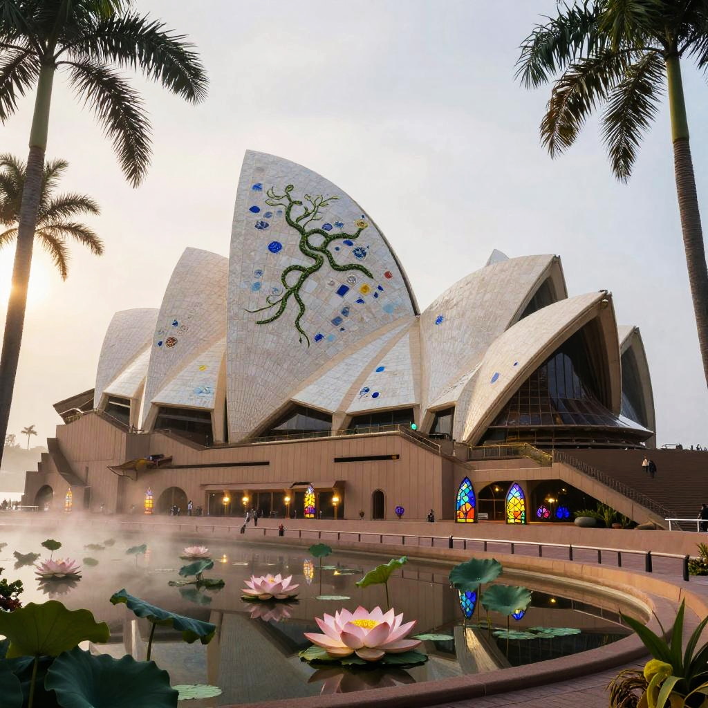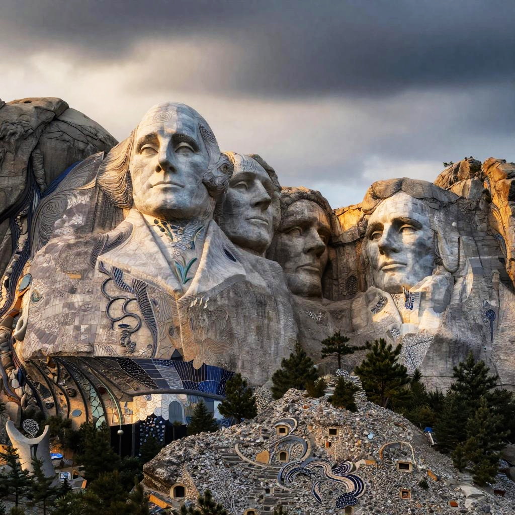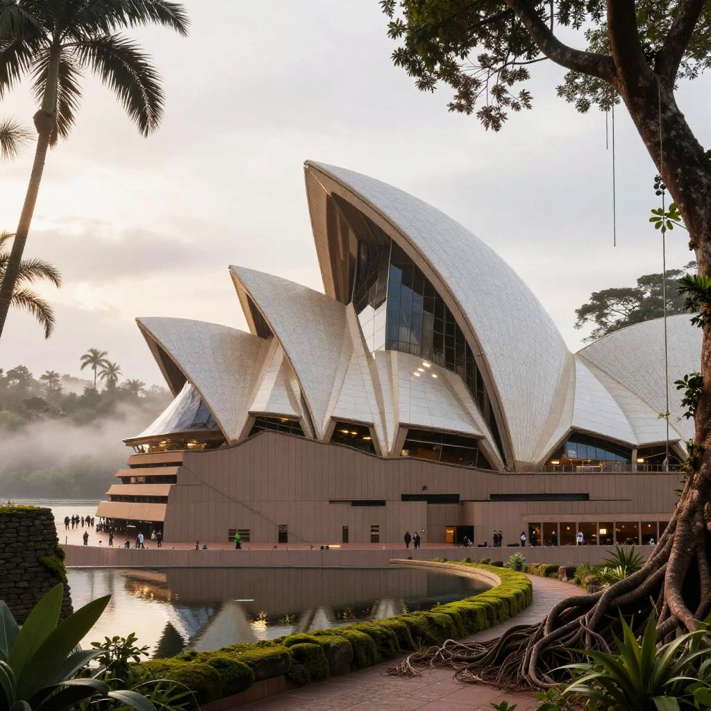 Machu Picchu reinterpreted through the vision of Frank Lloyd Wright, with minimalist concrete forms, reflection ponds, subtle earthy tones embellishing its form. The scene is surrounded by overgrown green terraces and misty hills for a stunning and surreal architectural showcase.