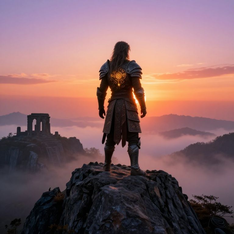 Basgiath standing majestically on a rocky mountain peak during sunrise, surrounded by mist and ancient ruins, wearing intricate armor with glowing runes, a fantasy epic atmosphere, vivid colors, cinematic lighting.