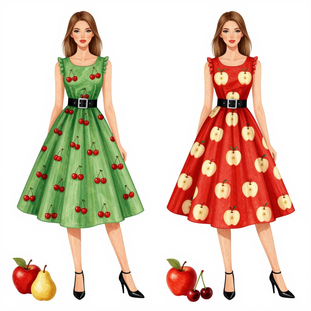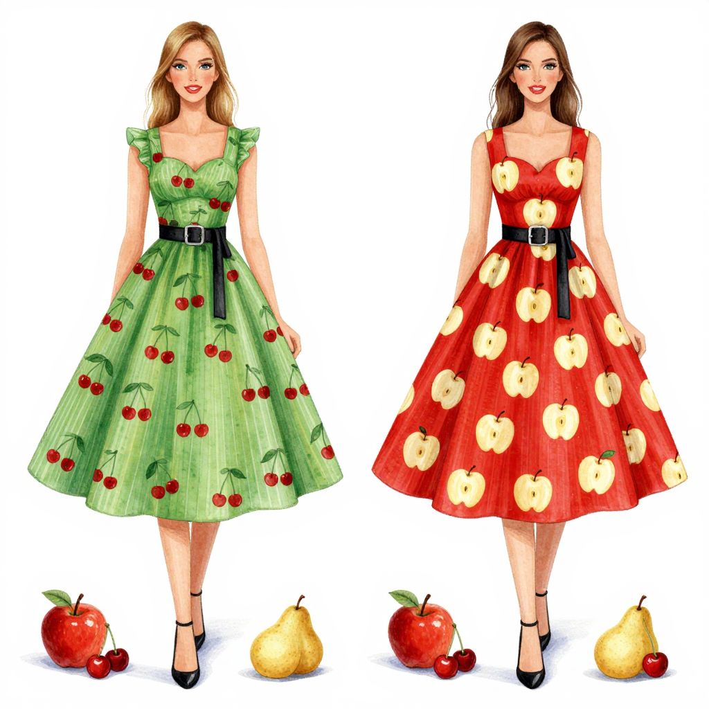 This digital illustration features two women in vintage-style dresses, standing side by side against a white background. The woman on the left wears a green dress with red cherry patterns and a black belt, paired with black heels. The woman on the right sports a red dress adorned with large yellow apple prints, also with a black belt and black heels. Both dresses are knee-length with ruffled sleeves and a full, flared skirt. At their feet, there are scattered fruits including red apples, pears, and cherries, enhancing the fruit-themed attire. The women have light brown and dark brown hair, respectively.