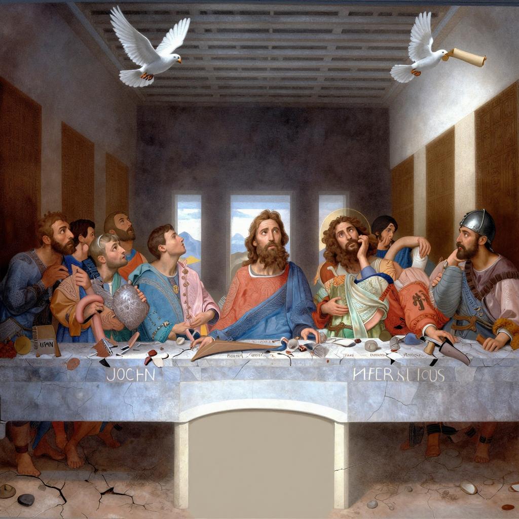 Illustration of the Last Supper. Ten male figures, diverse in appearance and clothing, stand behind a cracked, stone-like table. Names written on the table include John, Simon Peter, and Romaius. Central bearded man with a cloth over his shoulder. Man with a helmet on the right. Background shows a yellow halo and distant mountains. White doves fly overhead, one carrying a scroll. Facial expressions range from surprised to contemplative. Cracked ure throughout the image.
