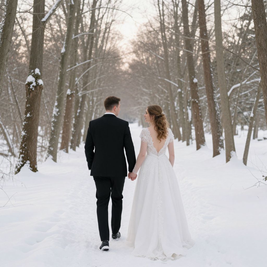 Man and woman walk hand-in-hand through a serene, snow-covered forest, the groom in a sharp black suit leading slightly ahead of the bride in an elegant white wedding dress with a delicate lace back, framed by tall, bare trees and a soft winter glow.