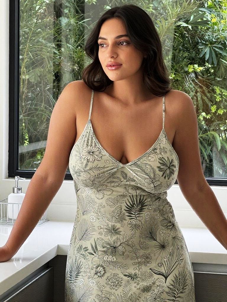 Casual portrait of a woman with big breasts in a printed sundress, warm undertone skin with natural dewy finish, wearing a mint dress with scattered flower pattern summer dress with thin straps, standing by a kitchen counter in front of a large window looking out onto lush greenery, relaxed friendly expression, slightly tousled shoulder-length hair, light stone counter with a single mug, soft natural overcast daylight light, lifestyle photography, high resolution