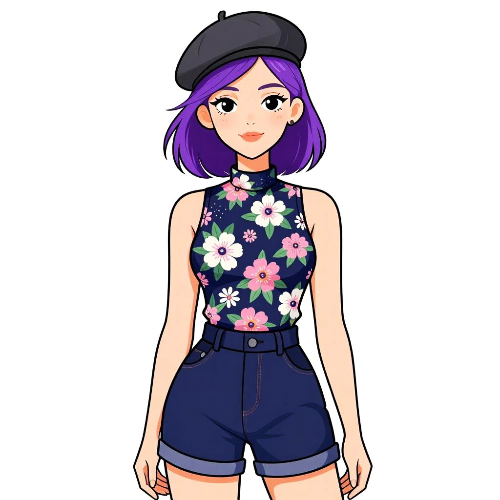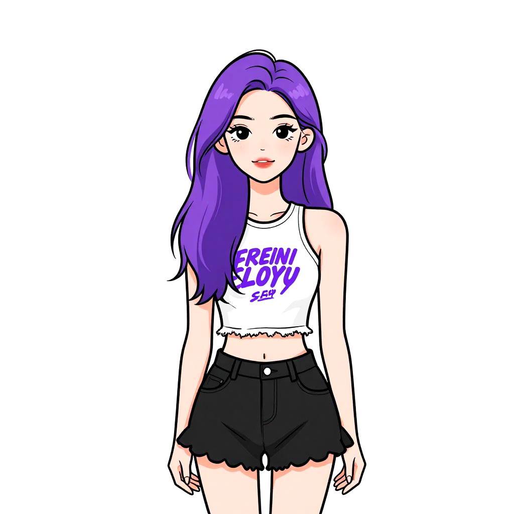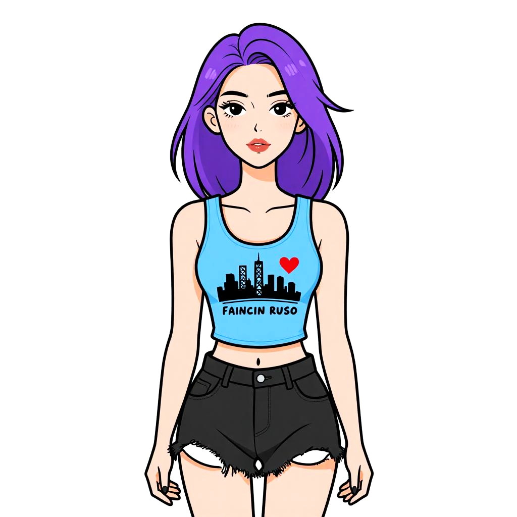 Woman with pretty face and pretty hair. Woman, casual streetwear, sky blue tank top with a graphic print depicting the San Francisco skyline and heart symbol, text overlay, scoop neck, relaxed fit, black shorts with frayed hem, white background --sref 1467