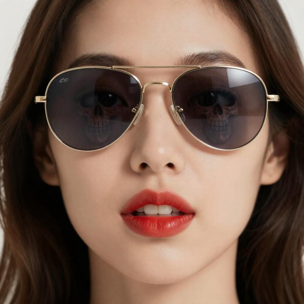 Close-up photograph of a woman's face, wearing reflective aviator sunglasses with a spooky skull pattern inside the lenses. She has full red lips slightly parted, revealing white teeth. Her brown hair frames her face. The background is a soft white.