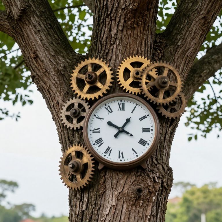 A clocktower grows organically from a tree's trunk, where gears integrate seamlessly with nature and time slips unpredictably.