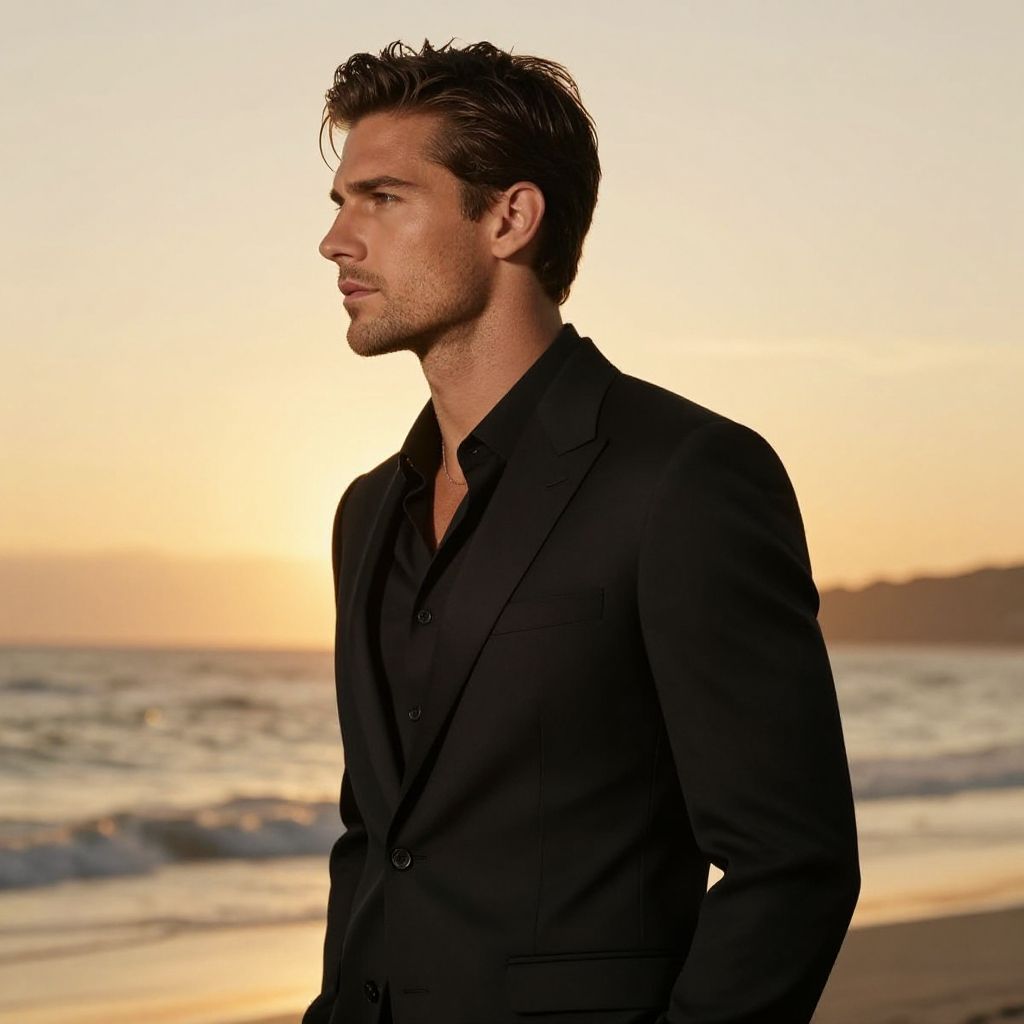 A handsome man stands in profile against a stunning sunset beach backdrop, exuding confidence and sophistication in a sleek black suit. The warm golden light highlights his defined features, creating a captivating and inspirational atmosphere.