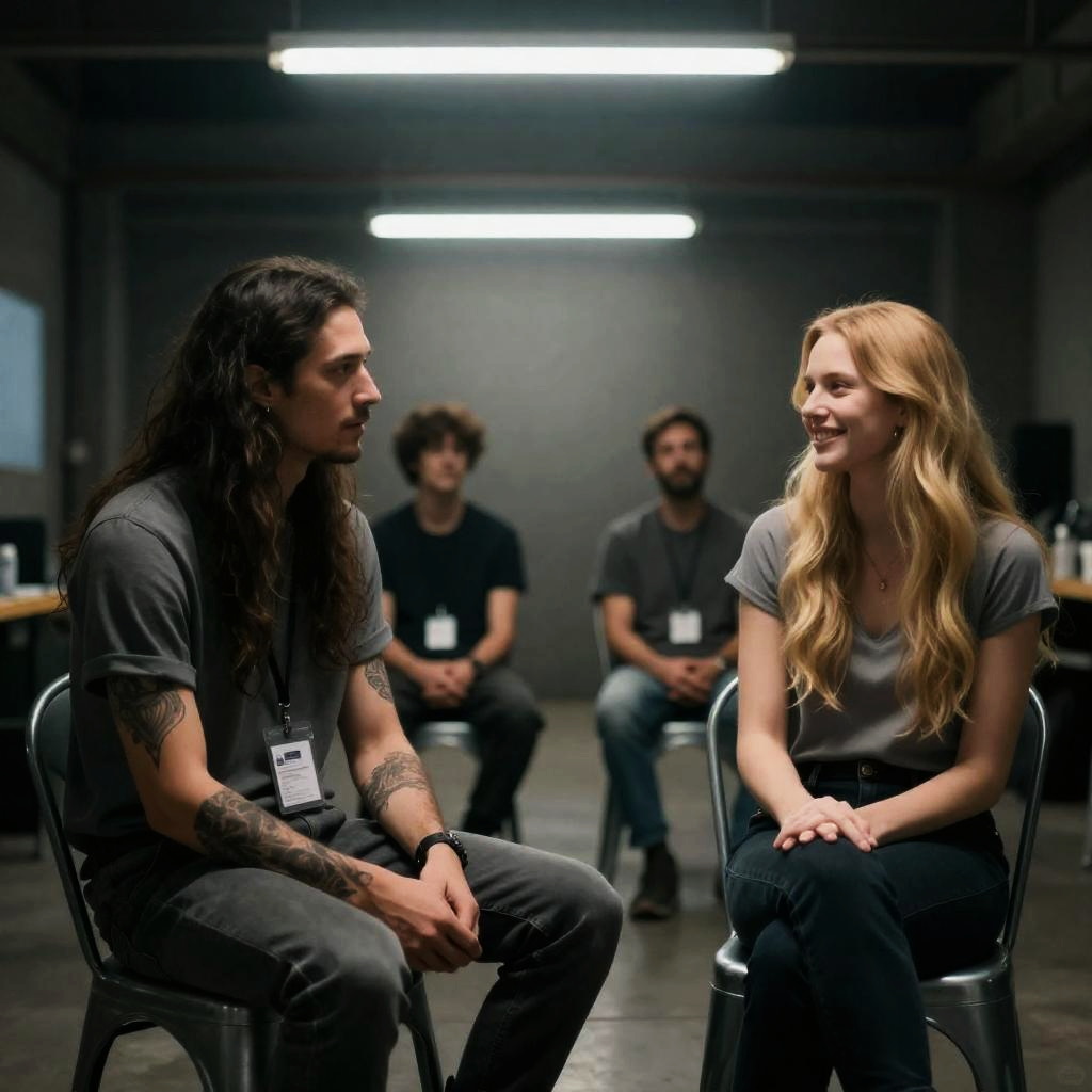 Photograph of a dimly lit room with three people. Two seated in the foreground, engaged in conversation. Man on left with long dark hair, gray t-shirt, visible tattoos, looking down. Woman on right with long brown hair, green jacket, smiling. Background person with shaved head, dark clothes, sitting alone. Industrial-style room with fluorescent lights, metal chairs, and concrete walls.