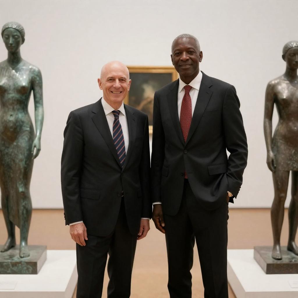 Photograph of two men standing side by side in an art gallery. The man on the left is bald, wearing a black suit with a white shirt and striped tie, smiling. The man on the right is taller, with dark skin, wearing a black suit with a white shirt and red tie, standing with hands in pockets. Abstract bronze sculptures frame them, and a white wall with a framed picture is in the background.