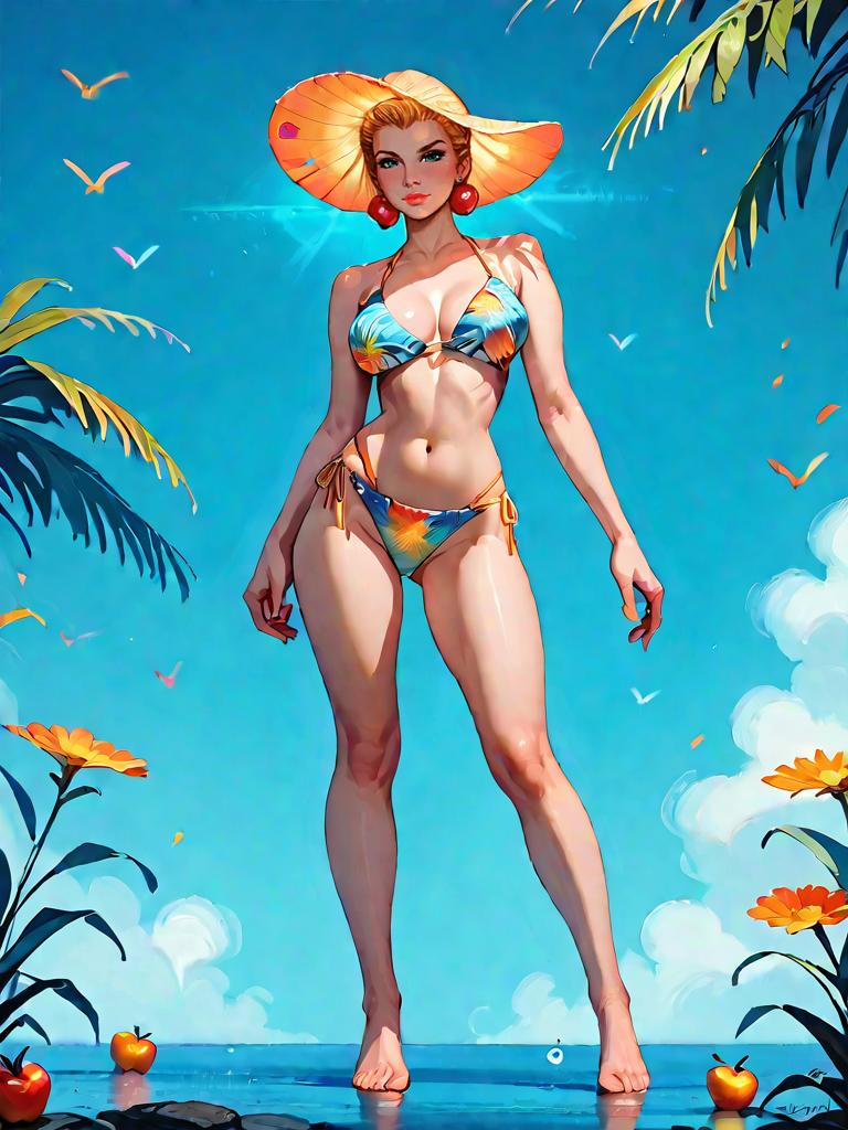 Digital illustration of a woman wearing a tropical print bikini with bold yellow pineapples, a triangle top and cheeky cut bottom made from smooth polyester blend. She accessorizes with a large orange sunhat and fruit-shaped earrings, standing barefoot against a bright blue sky background with palm leaves, flowers, and flying birds.