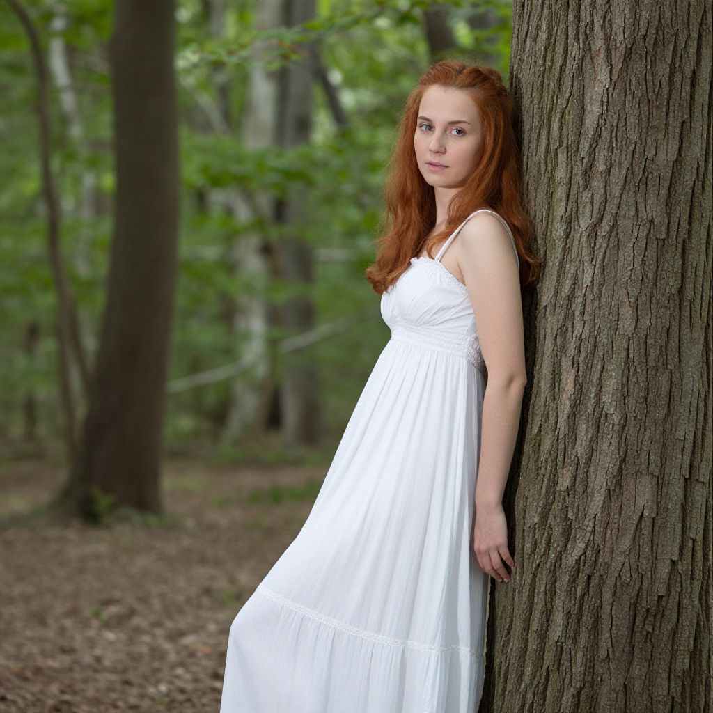 Photograph of a fair-skinned, red-haired young woman with wavy hair, standing against a tall tree in a dense forest. She wears a flowing, sleeveless white dress with a gathered waist, contrasting with the tree's dark, textured bark. The background features blurred green foliage and tree trunks, creating a serene, natural setting. Her expression is calm and slightly pensive, and she gazes directly at the camera. The lighting is soft, enhancing the peaceful atmosphere.