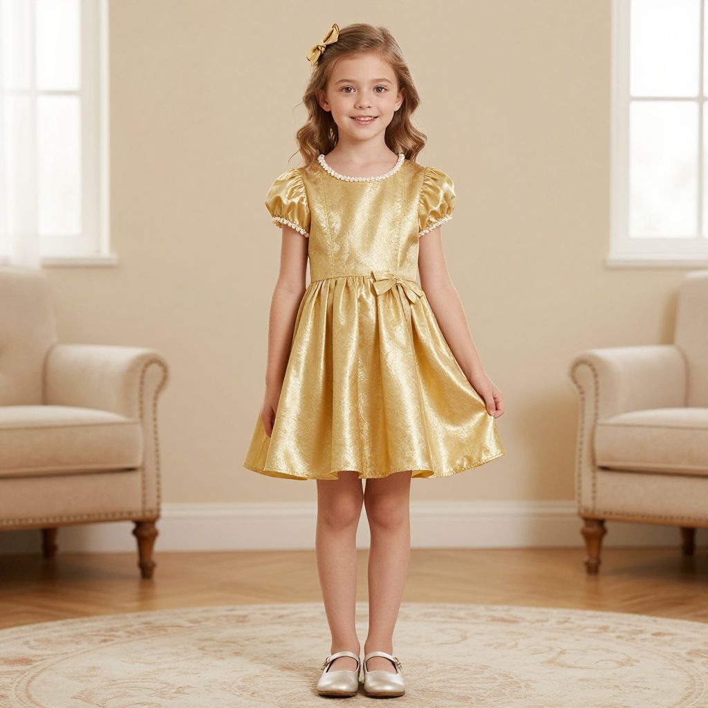 Photograph of a young girl with light brown, wavy hair adorned with a small yellow bow, standing in a brightly lit room. She is wearing a shiny, gold, short-sleeved, knee-length dress with a gathered waist and white Mary Jane shoes. The room features two beige armchairs with wooden legs, positioned symmetrically on either side of her, and a patterned rug on the wooden floor. The walls are cream-colored, and two windows with white frames are visible in the background, allowing natural light to flood the room. The girl is smiling and looking directly at the camera.