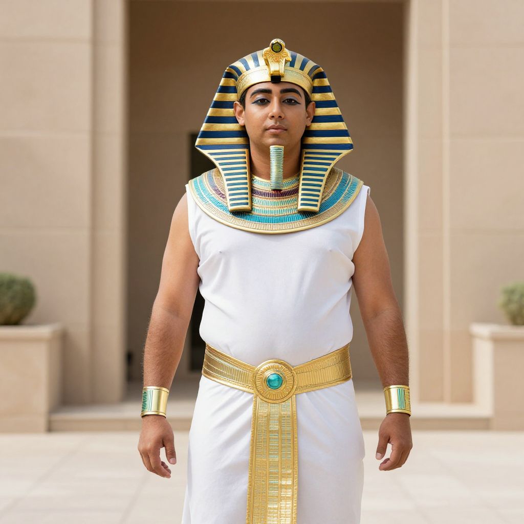 Photograph of a man in ancient Egyptian attire: white tunic, gold belt, striped nemes headpiece, blue and gold collar, standing in