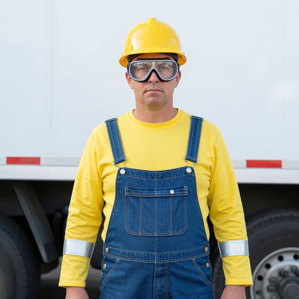Photograph of a Caucasian man standing in front of a white truck. He wears a bright yellow hard hat, large safety goggles, a yellow long-sleeve shirt, and dark blue denim overalls with white reflective stripes on the sleeves. He has a serious expression and stands with his arms at his sides. The background is slightly blurred, emphasizing the man's safety gear and clothing. The overall image has a high-contrast, almost cartoon-like quality, with vivid colors and sharp details. The truck's white and red stripe is visible in the background.
