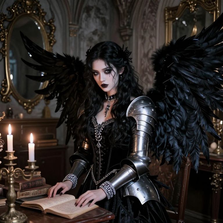 Gothic angel with black wings and silver armor reads in dimly lit, ornate room with candles and mirrors. Digital art.